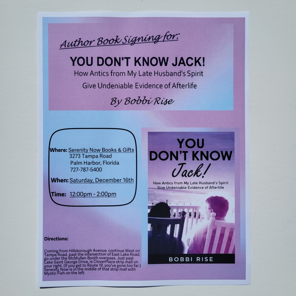 Waiting for my book to be released on 12/12/23 is hard, and anticipating my first book signing on Saturday, 12/16, in Palm Harbor, has me even more excited. Jack and I never had any patience, so when adding that with a whole lot of passion, the anticipation is huge and the flickering lights around my home abound. I have no idea what his spirit is experiencing from the other timeless side (You Don’t Know Jack!). For me, I just keep watching my calendar. One week from today “our” message will be launched, and Amazon and Barnes and Noble will officially release it. I feel like a little girl waiting for Santa, but, instead of expecting presents, I feel like we’re giving the present of comfort to anyone and everyone who would be open to it!